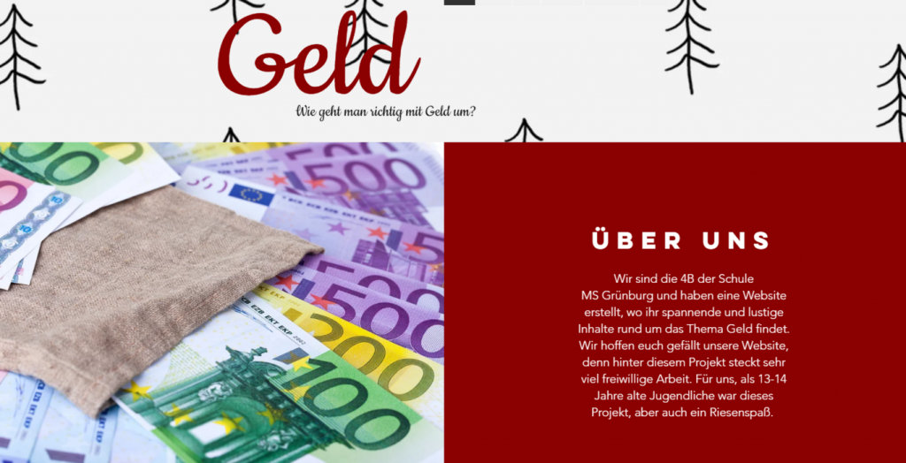 Die Schüler:innen der 4b Klasse der MS Grünburg haben sich zum Thema „Geld – das Taschengeld wird knapp“ verschiedene Beiträge überlegt und diese auf einer Website gesammelt. Darunter befinden sich eine Powerpoint Präsentation zum Thema Geld, ein Kreuzworträtsel, eine Umfrage, welche mit Schüler:innen der MS Grünburg durchgeführt und ausgewertet wurde, und es wurde sogar ein eigenes Video erstellt und eigenständig geschnitten.