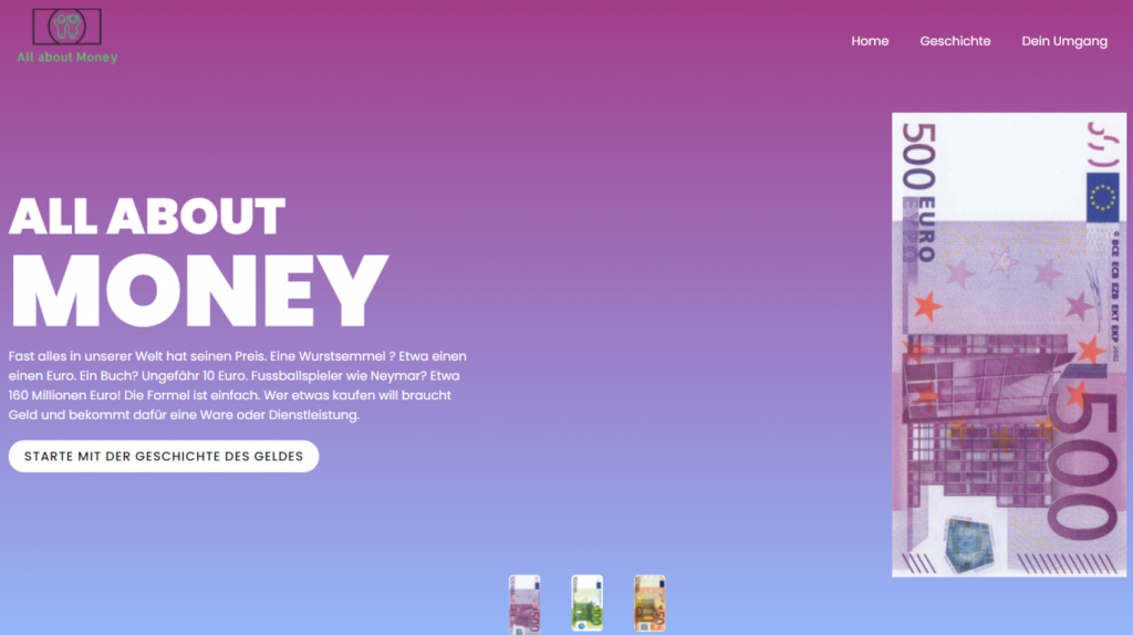 Das Projekt „All-about-Money“ von Michael Zaminer aus dem BG 19 in Wien ist eine selbst programmierte Info-Website. Auf dieser Website erfährt man einiges zur Geschichte von Geld, man erhält Tipps für den richtigen Umgang mit Geld und abschließend kann man in einem Quiz das erworbene Wissen testen. Ziel des Projekts ist es, jungen Leuten den Umgang mit Geld und die Geschichte mit digitalen Mitteln näherzubringen.